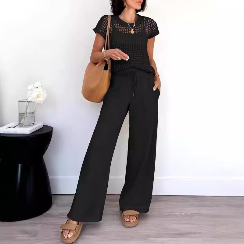 Women’s Two-Piece Set – Pleated Texture – Short Sleeve Top – Wide-Leg Pants