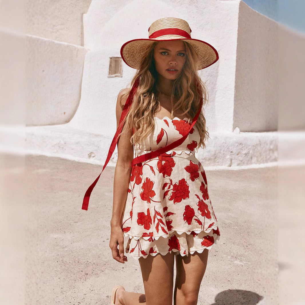 Women’s Two-Piece Set – Cotton Blend – Peplum Top with Spaghetti Straps – Wide-Leg Pants – Ethnic Print