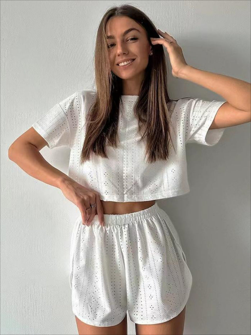 Women’s Two-Piece Set – Relaxed Fit Crop Top & Shorts – Breathable Perforated Fabric