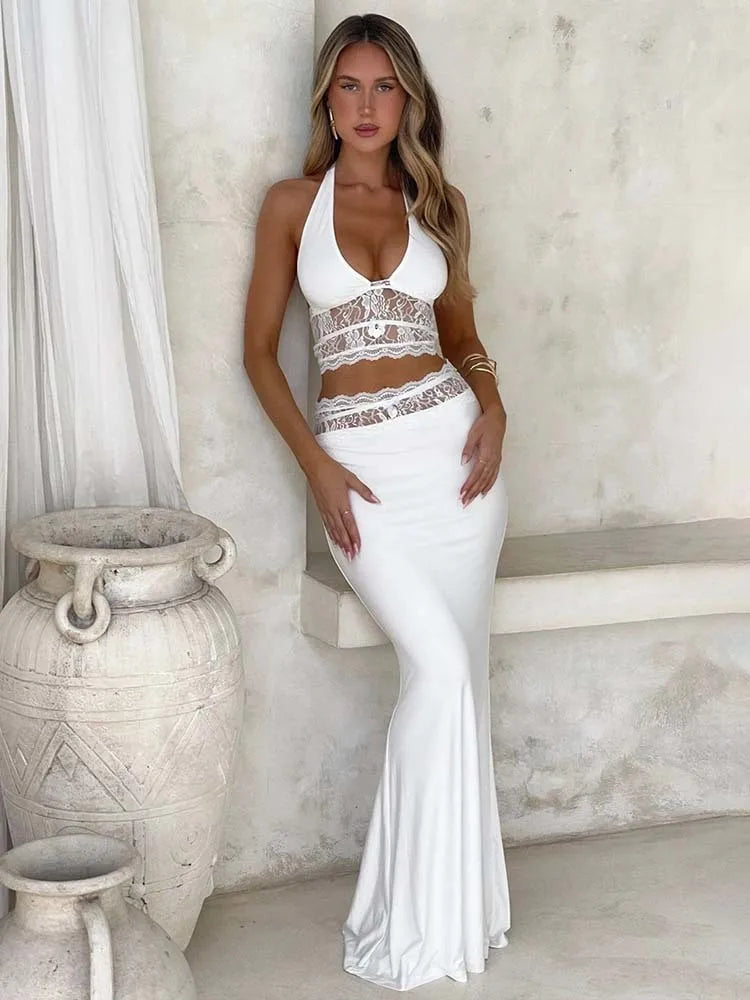 Women’s Two-Piece Set – Halter Crop Top – Mermaid Skirt – Stretch Lace Evening Wear