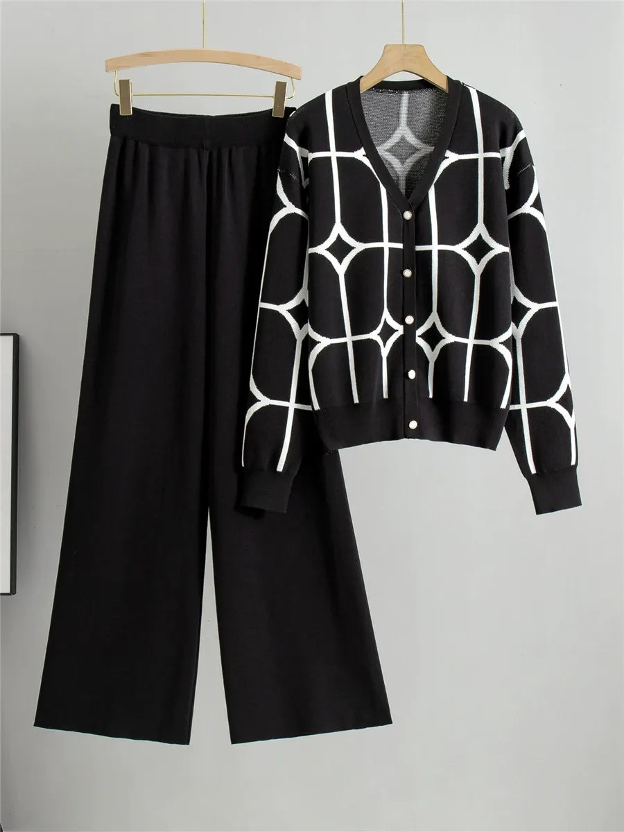 Women’s Two-Piece Set – Knitted V-Neck Cardigan and High-Waisted Wide-Leg Pants
