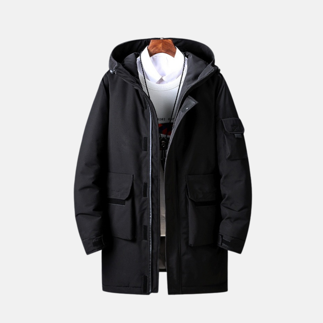 Men's Winter Down Jacket with Hood – Warm Parka Coat, Windproof, Heavy Duty Cotton Shell, Multiple Pockets