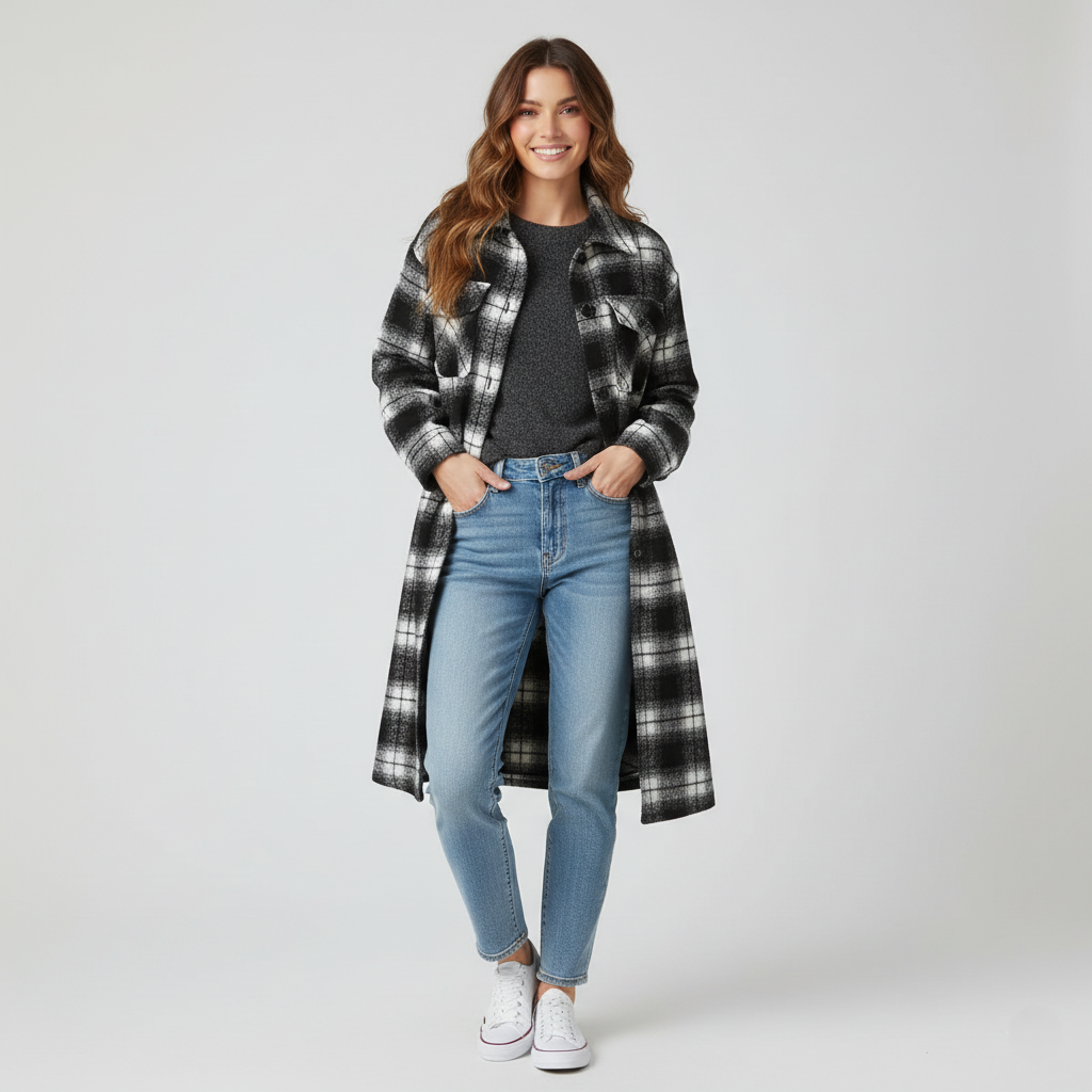Women’s Shacket - Woven Fabric - Oversized Fit - Long Length - Plaid Pattern
