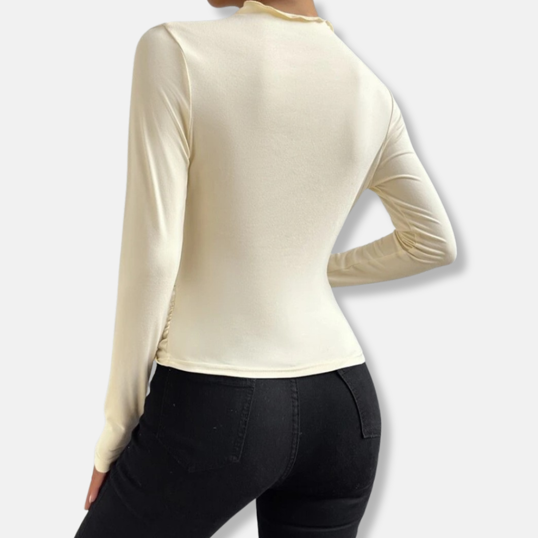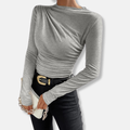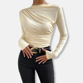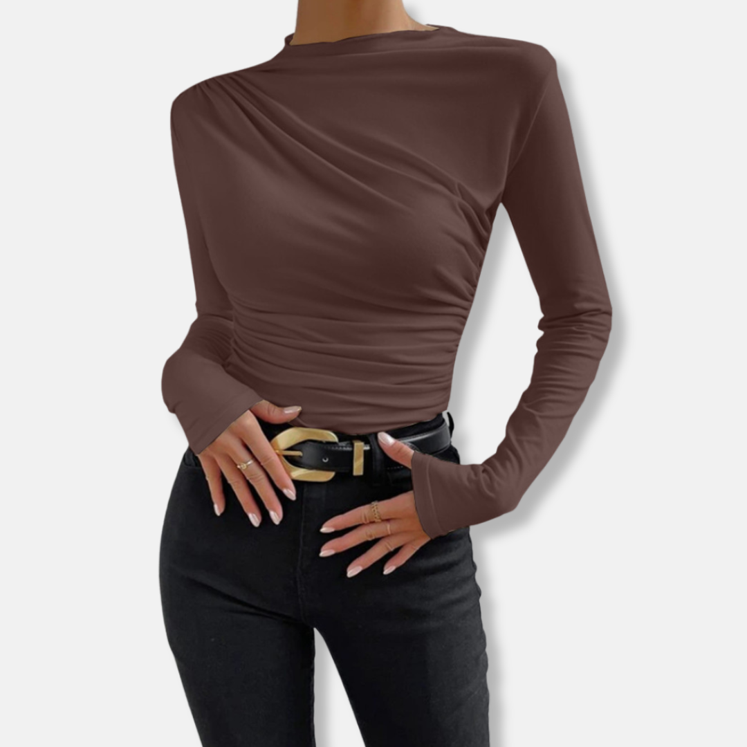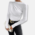 Crafted from soft cotton, this fitted long sleeve top for women features an asymmetric neckline and elegant draped and ruched details, making it ideal for smart casual occasions.