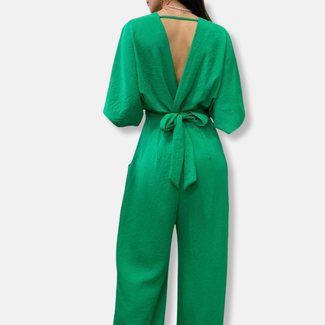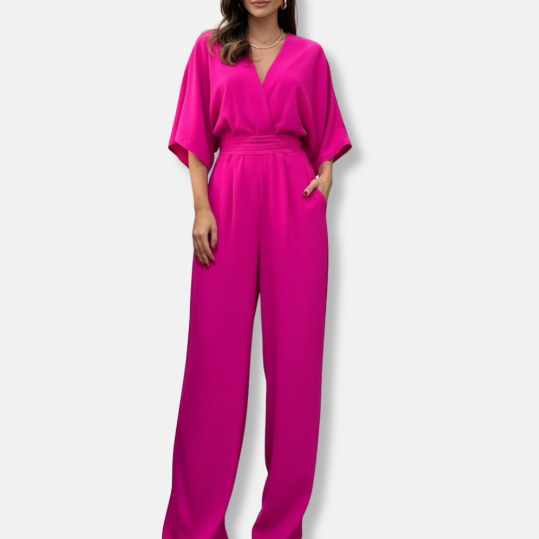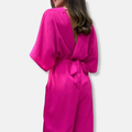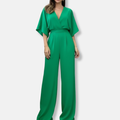 For a sophisticated cocktail occasion, consider this full-length jumpsuit. Its relaxed fit is enhanced by an elegant satin material featuring a subtle jacquard pattern. The design includes a flattering V-neckline, distinctive kimono sleeves, and a chic wrap front that flows into a wide leg, complete with practical side pockets and a defined waist.