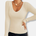 This slim fit ribbed knit top for women features a deep V-neck and long sleeves, offering a hip-length silhouette perfect for casual wear. The solid design is enhanced by subtle ribbed detailing.