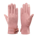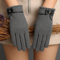 The form-fitting gloves offer a sleek profile, perfect for your winter outdoor activities. Adorned with a charming bow detail and finished with a sophisticated contrast trim, these gloves provide both elegance and practicality. Their design ensures a snug fit, keeping you comfortable while maintaining a refined appearance.
