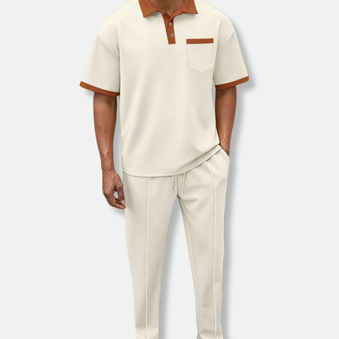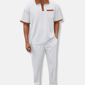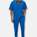 This coordinated two-piece set for men offers a relaxed approach to casual dressing. It features a textured, relaxed fit polo shirt with a collared neckline and short sleeves, detailed with a button front, chest pocket, and contrast trim. Complementing this is a pair of textured, relaxed tapered fit jogger pants, designed with an ankle-length cut, drawstring waist, and side stripe for a complete, comfortable ensemble.