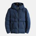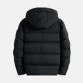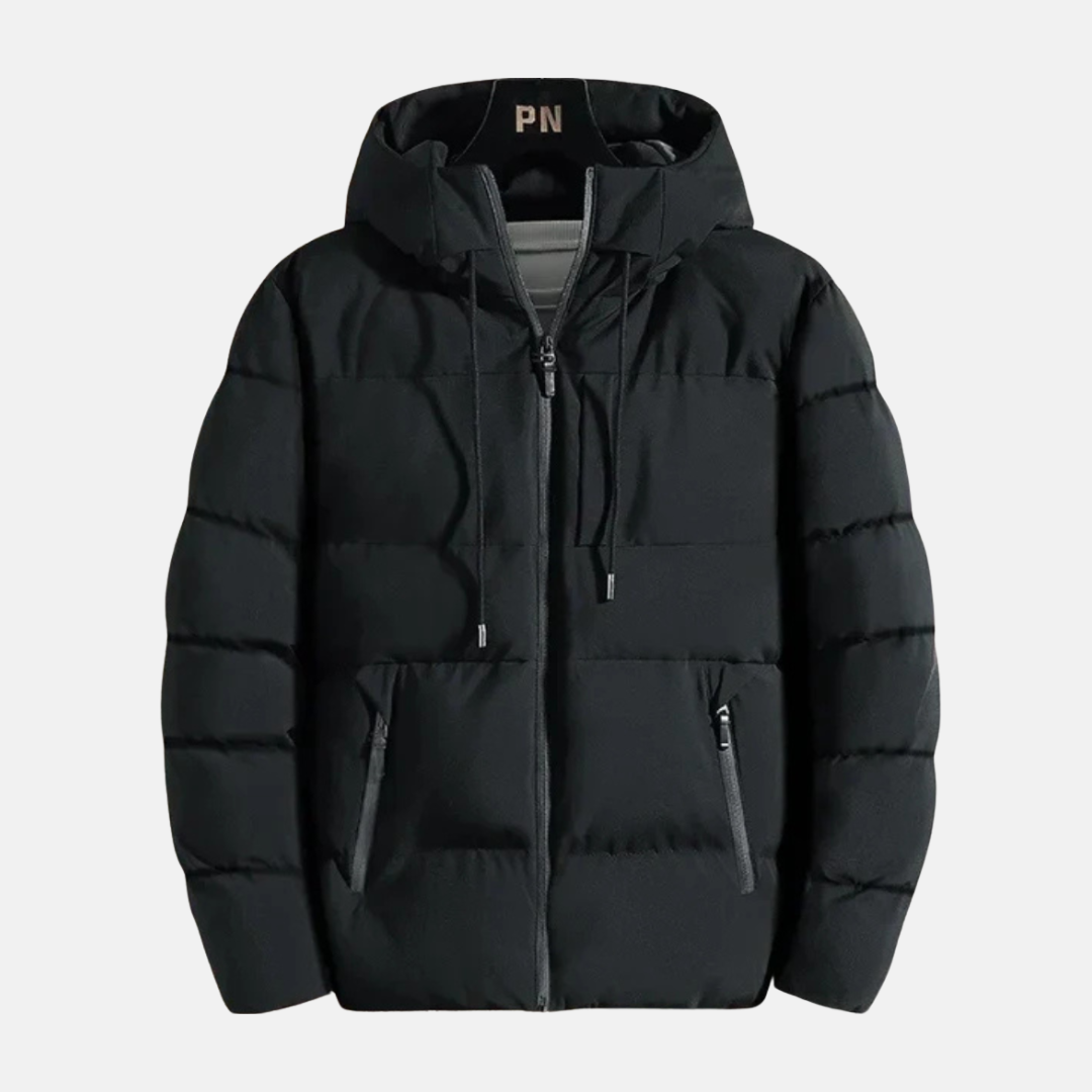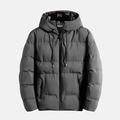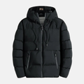 A relaxed fit puffer jacket designed for men, perfect for casual wear. This hip-length, hooded jacket features a solid pattern and long sleeves, complete with quilted detailing, a zipper front, drawstring hood, and convenient zipper pockets.