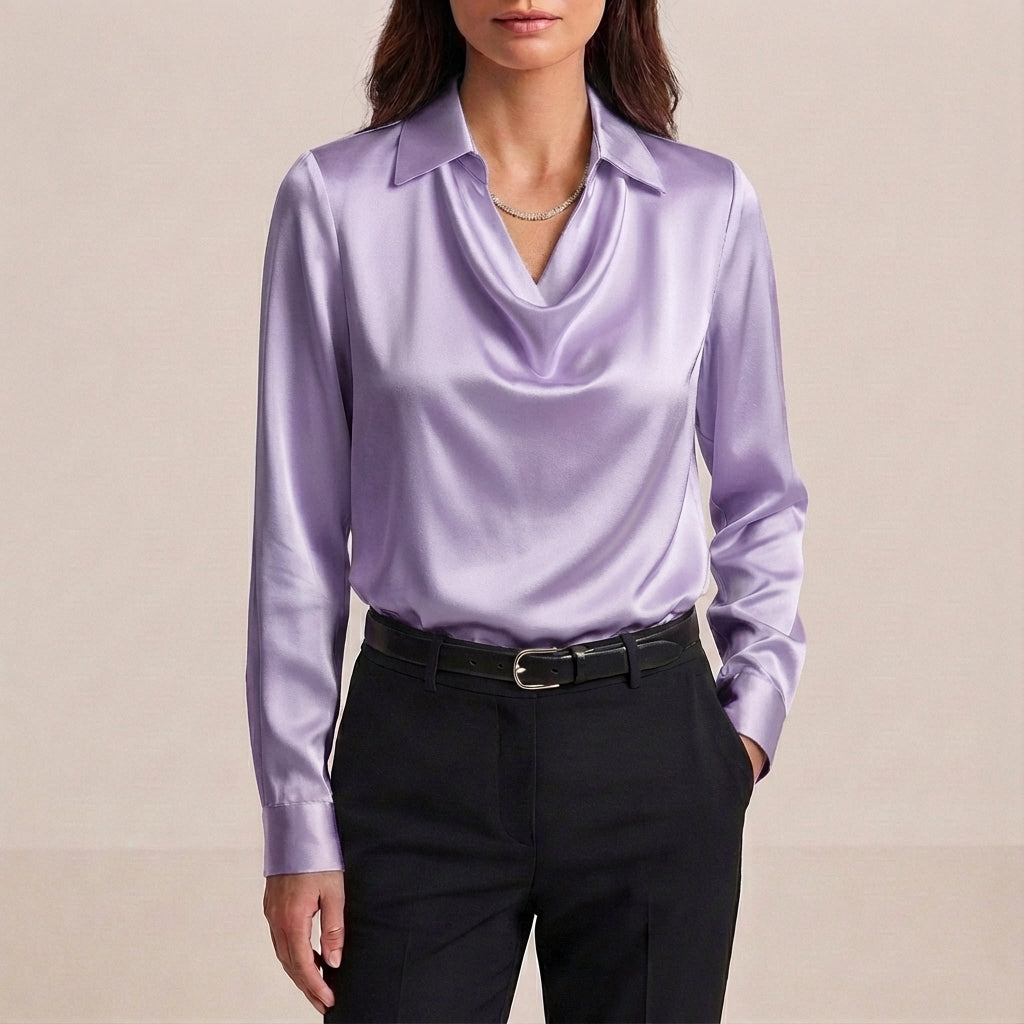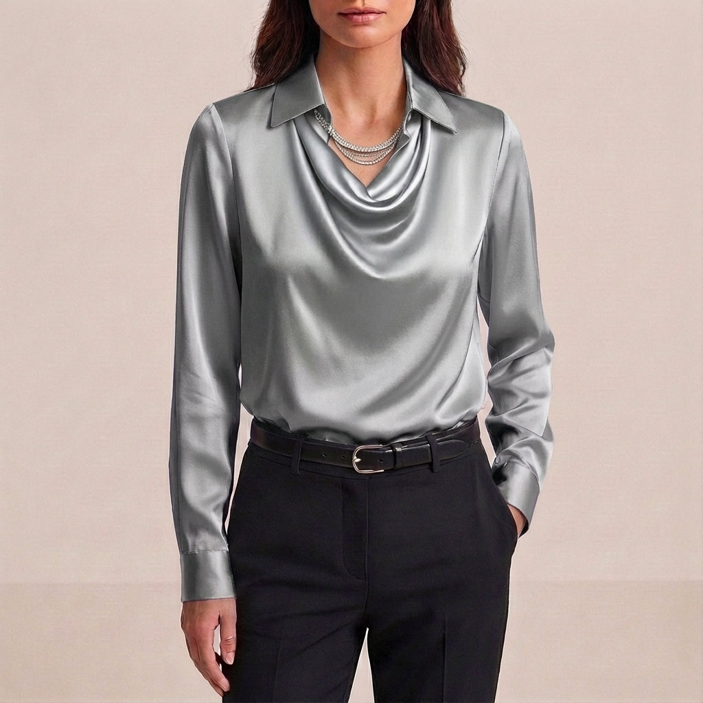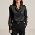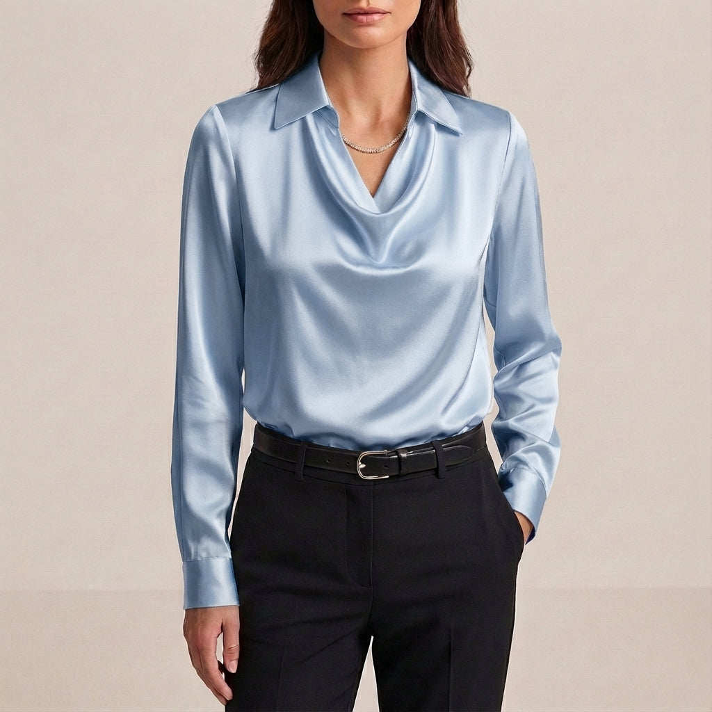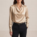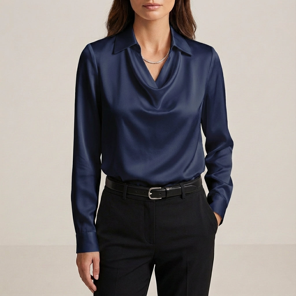 Make an entrance with the Blaze silk statement blouse, featuring a distinctive draped cowl V-neck and collar accent. Its tailored fit in luxurious silk offers a sophisticated silhouette, perfect for any formal chic occasion where you want to stand out.