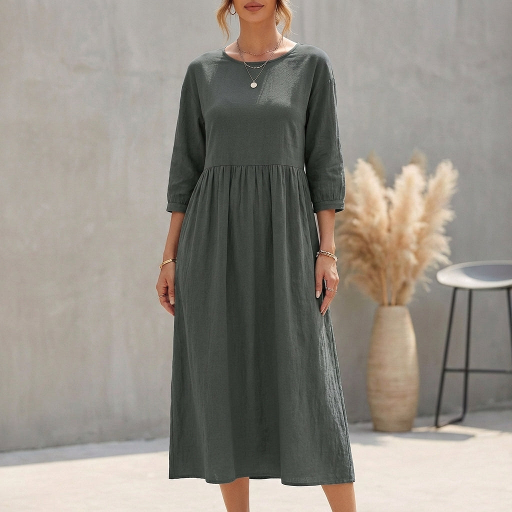 Crafted from a breathable, high-quality fabric, this dress features a gently gathered waist that offers a flattering drape, while the midi length provides graceful movement. The subtle texture of the material adds a touch of organic charm, perfect for both casual and elevated ensembles. Cinch it with a statement belt for a defined waist or let it flow freely for an easy, bohemian vibe. Pair it with artisanal sandals for daytime excursions or elevate the look with espadrille wedges for an evening out.