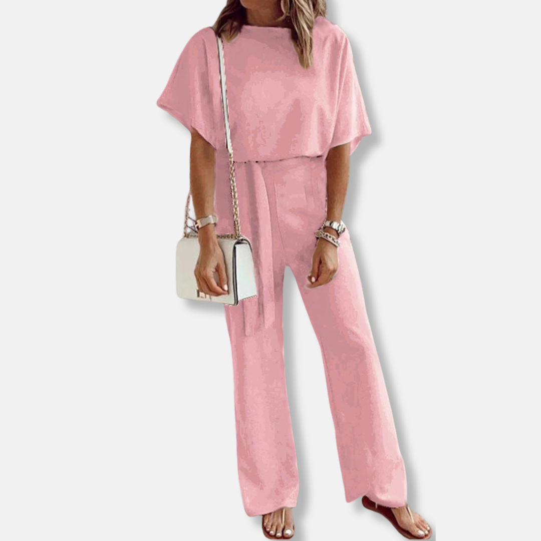 - Design: Round neckline, short sleeves, belted waist, wide-leg fit