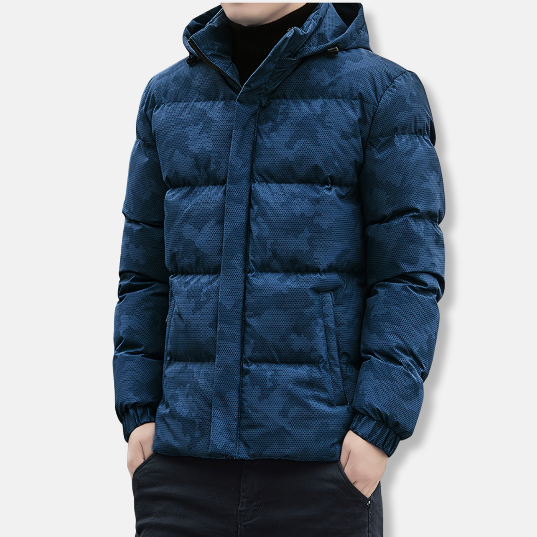 Designed for men, this relaxed fit nylon puffer jacket is a versatile choice for casual occasions. It features a distinctive camouflage print, a high neck, and long sleeves, complete with a hood and quilted detailing. Practical elements like a snap button placket, front pockets, and elastic cuffs enhance its hip-length silhouette.