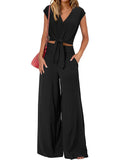 - Design: V-neck lace-up top paired with high waist wide leg pants for a flattering silhouette.