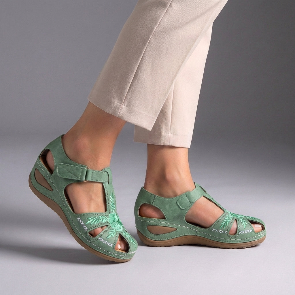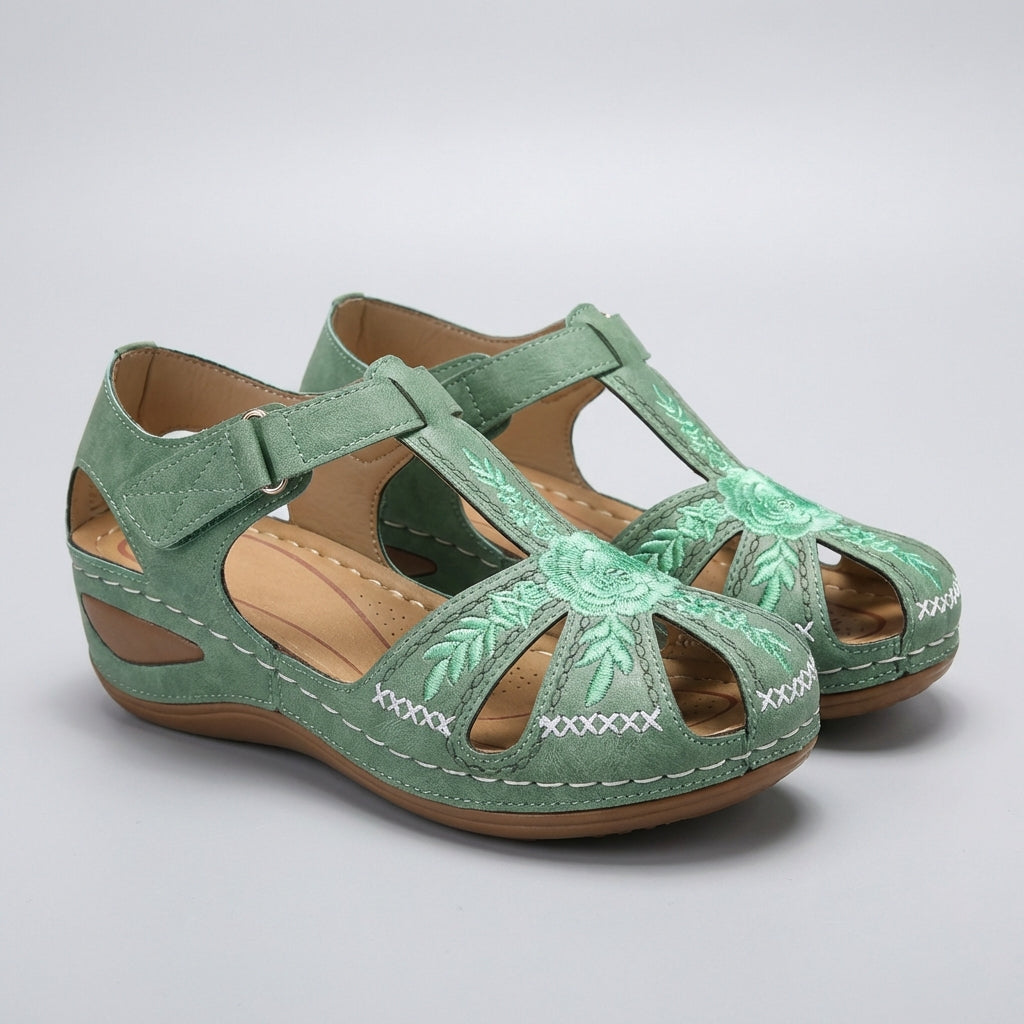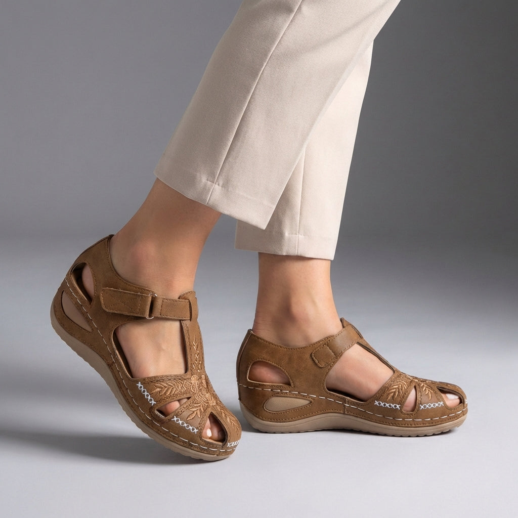 Crafted for enduring comfort, these sandals feature a thoughtful closed-toe design adorned with intricate hollow cut-outs and delicate embroidery on the vamp, creating a captivating vintage-inspired aesthetic. The low wedge heel offers subtle elevation without compromising stability, while the adjustable Velcro strap ensures a personalized, secure fit. Pair them with flowing linen trousers or a vibrant sundress for an impeccably chic daytime ensemble.