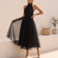This piece features a delicate sheer neckline that transitions into a stunning open-back silhouette, offering a hint of allure balanced by a sophisticated midi length. The bodice is meticulously gathered to highlight the waist, flowing seamlessly into a voluminous skirt crafted from layers of fine mesh for a cloud-like movement. To complete the look, style it with statement earrings and a pair of translucent block heels.
