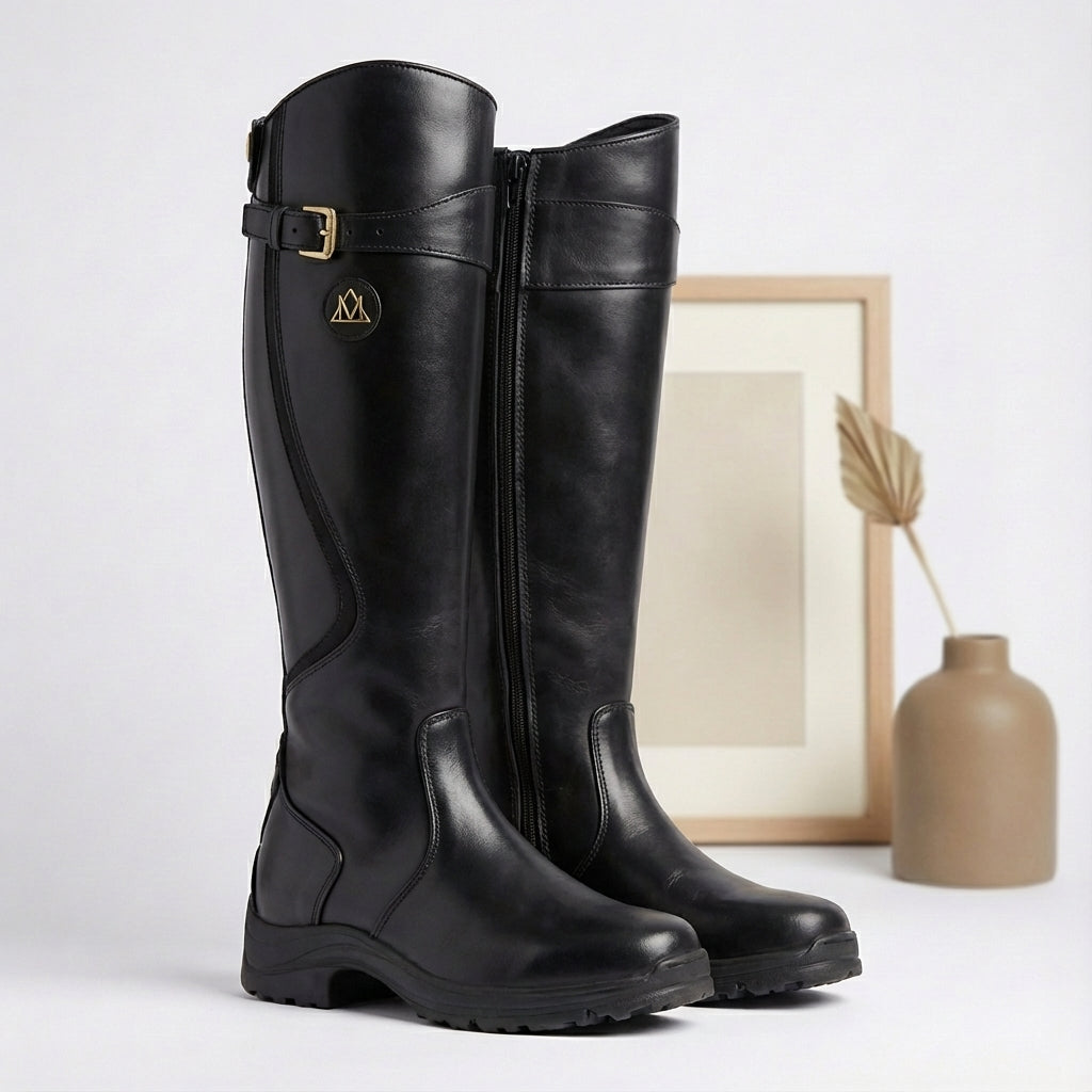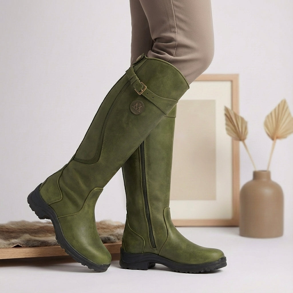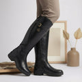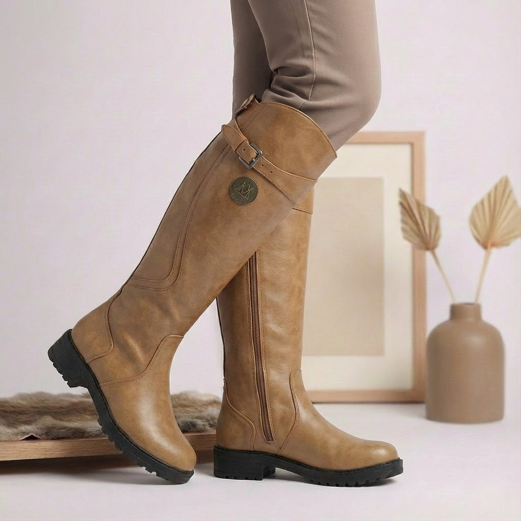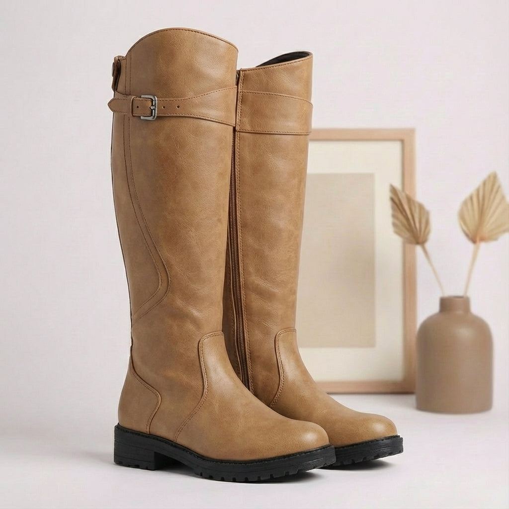 The Fallon knee-high boots deliver a structured fit with prominent buckle accents and metallic embellishments. Made from quality faux leather, these boots include practical zip details and a treaded sole, ensuring comfort and style for any casual outdoor setting.