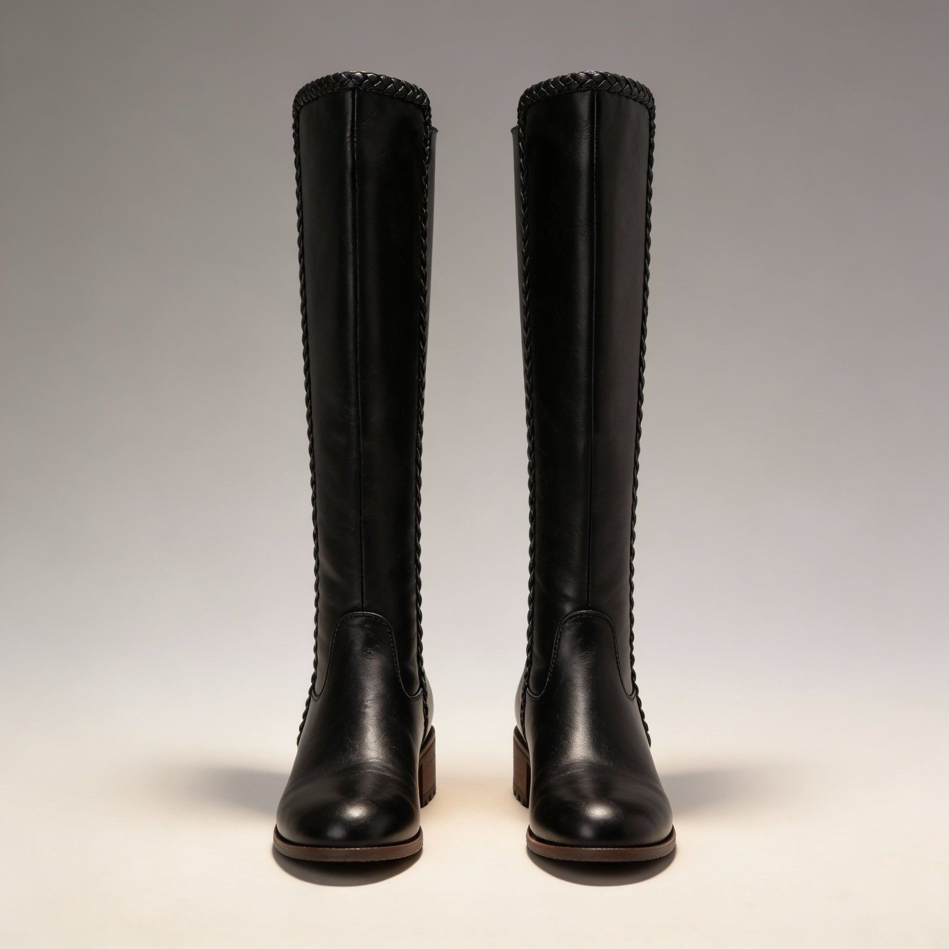 These Fallon leather riding boots command attention with their classic knee-high silhouette and distinctive braided trim. Crafted from quality leather with a comfortable regular fit and stacked heel, they're the perfect choice for a casual outing that demands style and substance.