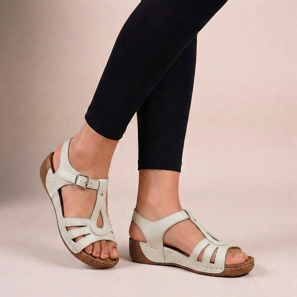 Crafted from supple faux leather, these T-strap sandals offer a refined yet comfortable fitted silhouette. The open-toe design, enhanced with delicate cut-out details on the front strap, provides a breathable feel, while the subtle wedge sole adds a touch of elevation without sacrificing ease. The meticulous contrast stitching along the sole highlights artisanal craftsmanship. Pair them effortlessly with a flowing maxi dress for an afternoon brunch or tailored linen shorts for an elevated casual look.