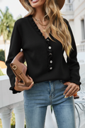 Say hello to Greta, a long-sleeved button-down ruffle trim sweater that combines classic elegance with modern charm. This stylish sweater features delicate ruffle trim and a button-down front, making it perfect for both casual and dressy occasions.