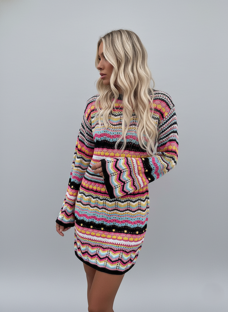 Step into playful elegance with the Luna Multicolor Crochet Knitted Sweater Dress. Designed with vibrant rainbow-inspired patterns and an airy crochet texture, this dress adds a fresh, boho-chic vibe to any outfit. With its relaxed fit, soft knit feel, and eye-catching color mix, Luna is your perfect go-to for sunny days, beach strolls, and stylish casual outings.