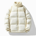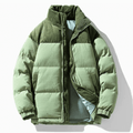 This oversized puffer jacket, designed for men, features a sophisticated stand collar and a hip-length cut. Its quilted finish, combined with ribbed panels and elasticated cuffs, offers both style and comfort. A convenient zipper front ensures easy wear, making it ideal for casual occasions.