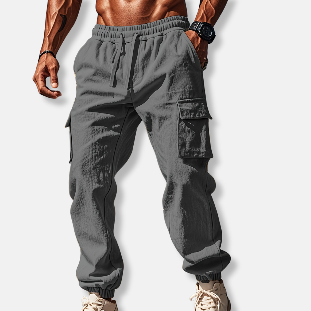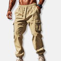 These relaxed fit cargo pants for men offer a comfortable, full-length design. Featuring practical cargo pockets and a flexible drawstring waist, they are ideal for casual wear.