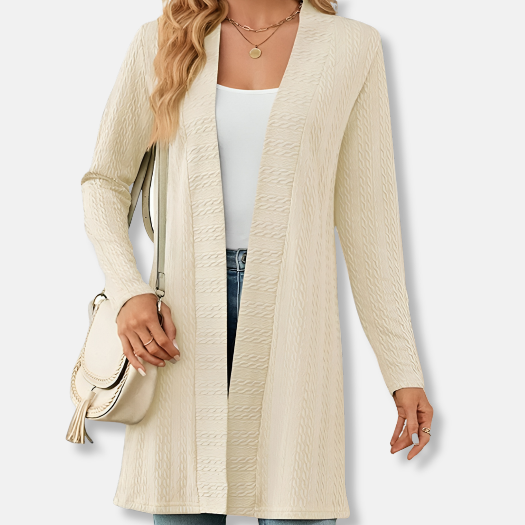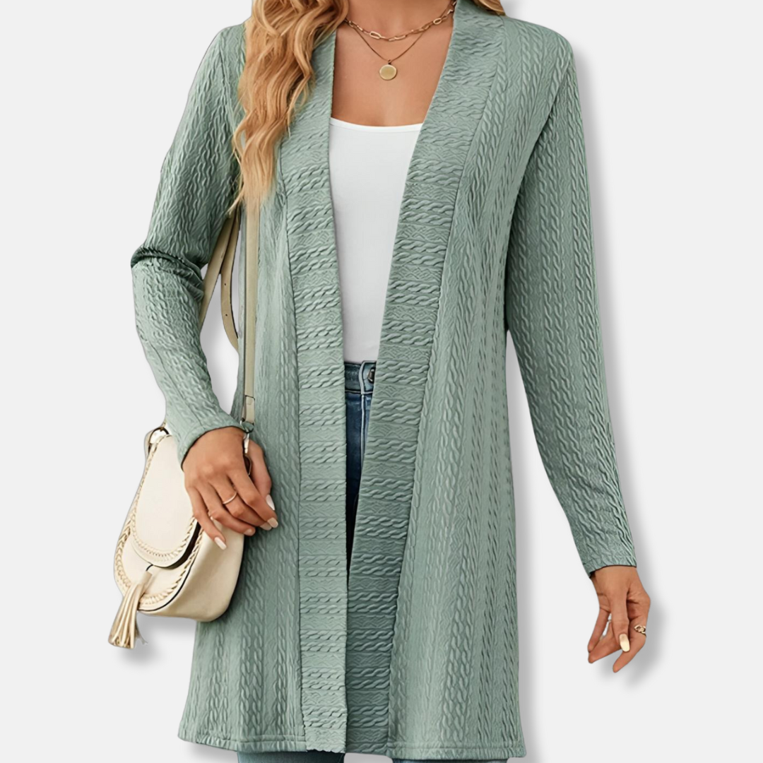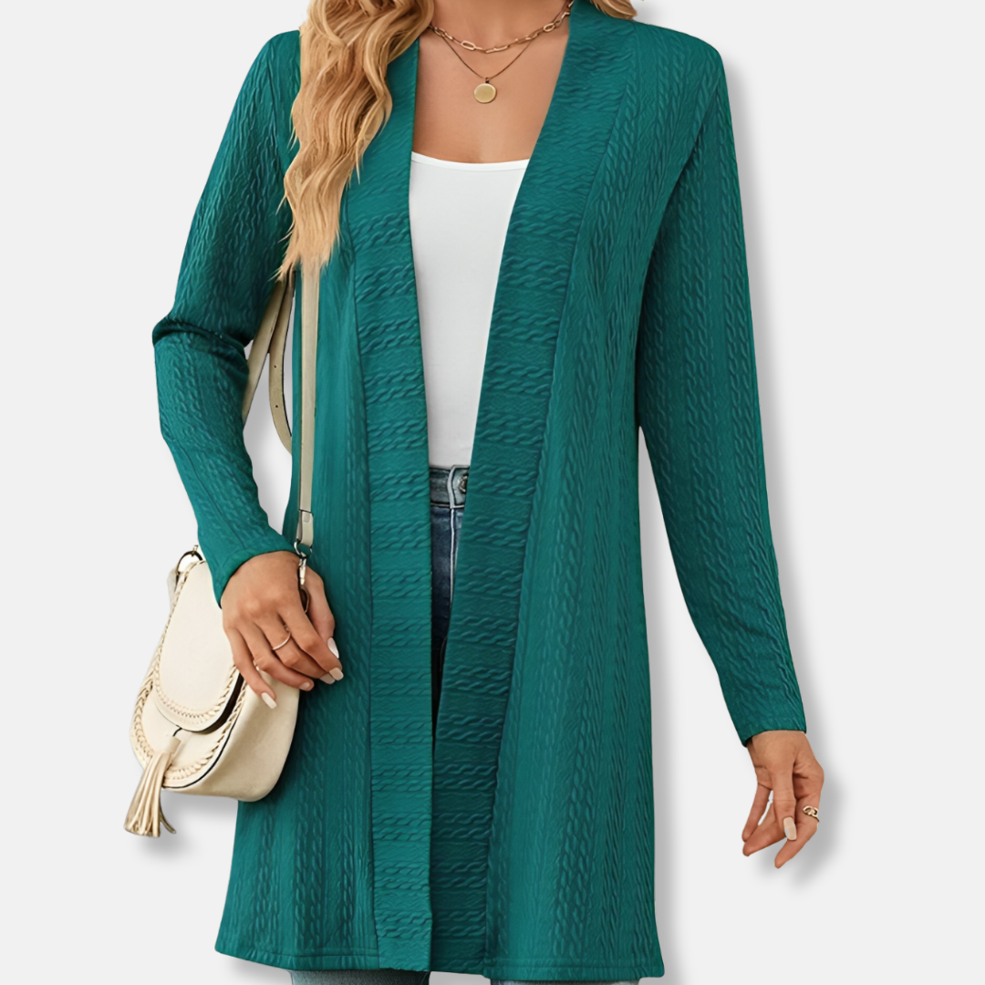 This relaxed fit cardigan for women features an open front and a textured pattern, offering a mid-thigh length for versatile casual wear.