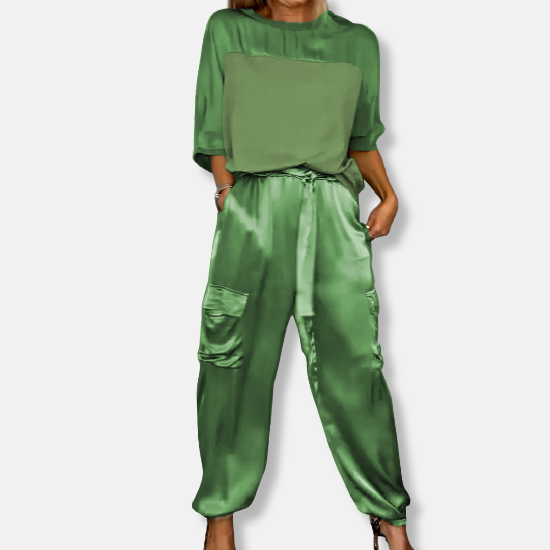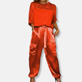 A relaxed fit two-piece set for women, crafted from smooth satin. This casual ensemble features a short sleeve top and coordinating jogger pants, offering a comfortable yet refined option for everyday wear.