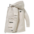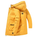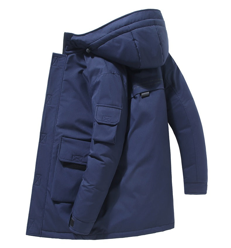 Embrace the cooler seasons with this mid-length puffer jacket, designed for men seeking a relaxed fit. Featuring a high neck with a hood and practical flap pockets, this piece offers a comfortable and casual option for everyday wear.