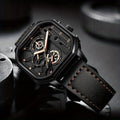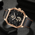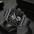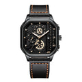 The Jaxon Chrono Watch makes a statement with its architectural square case and industrial-inspired design. Crafted with a multi-layered dial, chronograph functionality, and a contrast-stitched leather strap, it’s the definitive timepiece for bold everyday style.