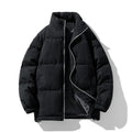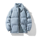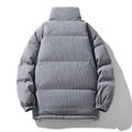 Crafted for men, this hip-length puffer jacket offers a relaxed fit, ideal for casual wear. It features a stand collar and long sleeves, designed with a solid pattern. Practical details include a zip front, elastic cuffs, and side pockets, complemented by a drawstring hem and ribbed, padded construction.