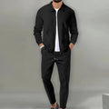This coordinated two-piece set for men presents a relaxed fit collared zip-up jacket, complete with long sleeves and hip-length coverage. It is perfectly paired with tapered fit ankle-length trousers. Both garments showcase a distinctive micro-grid pattern, offering a cohesive look ideal for a casual occasion.