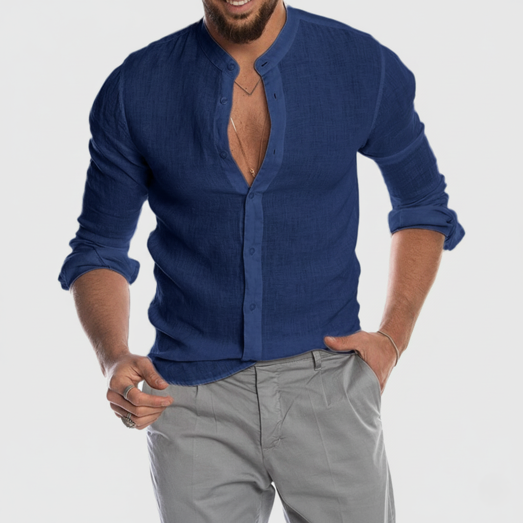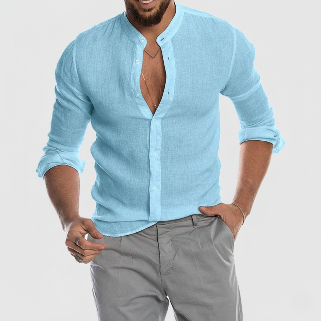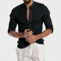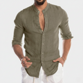 Men's Long-Sleeve Shirt - Mandarin Collar - Button-Down Tailored Fit - Lightweight Casual Wear from Couture-Emporium. This shirt features a minimalistic mandarin collar, button-down front, and tailored fit. Made from a lightweight linen blend, it's perfect for warm weather and relaxed occasions.