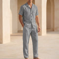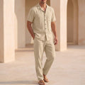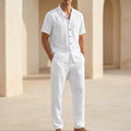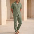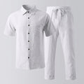 Crafted from premium, breathable linen, this ensemble offers a beautifully relaxed fit that drapes with elegant ease, ensuring ultimate comfort in warmer climates. The classic lapel collar shirt, featuring short sleeves and a button front, pairs seamlessly with the coordinating ankle-length trousers, which boast practical side pockets. For an elevated look, style with shimmering sandals and delicate jewelry, or keep it understated with minimalist flats.