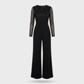 Make an entrance in the Luna knit jumpsuit, featuring a dazzling sequined bodice and dramatic wide-leg silhouette. Designed for evening wear, its comfortable knit fabric, high-waist fit, and sheer long sleeves ensure you command attention without sacrificing comfort.