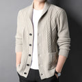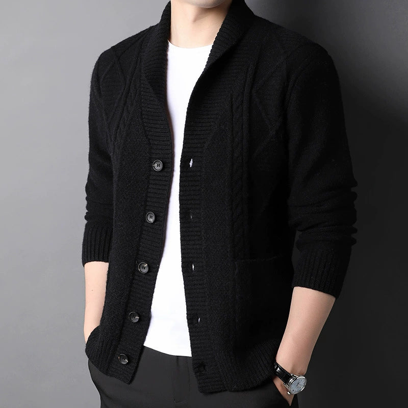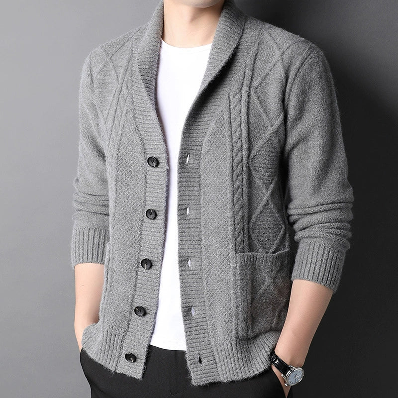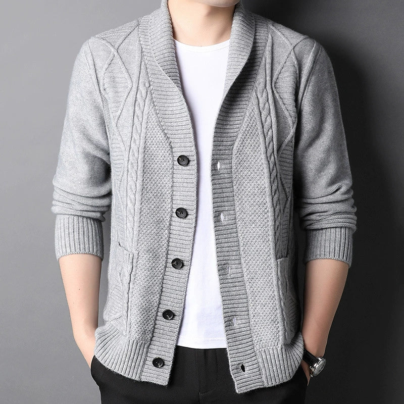 This Regular Fit cardigan for men features a distinguished shawl collar and intricate cable knit pattern, perfect for casual wear.