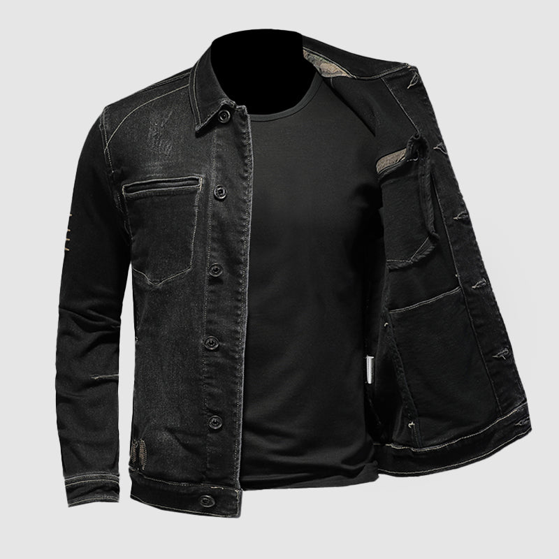 This black denim jacket is a statement piece that will instantly elevate any outfit. With its distressed details and rugged design, it's perfect for adding a touch of edge to your wardrobe. The comfortable fit and multiple pockets make it both practical and stylish. Whether you're heading out for a night on the town or a casual outing, this jacket is a must-have for any fashion-forward man.