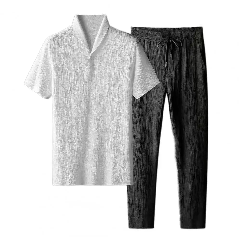 This set is a stylish and comfortable choice for warm weather. The textured polo with a notched collar and half-zip closure adds a touch of sophistication, while the matching pants offer a relaxed fit and drawstring waist for added comfort. Perfect for casual outings or vacations, this set is both stylish and breathable..