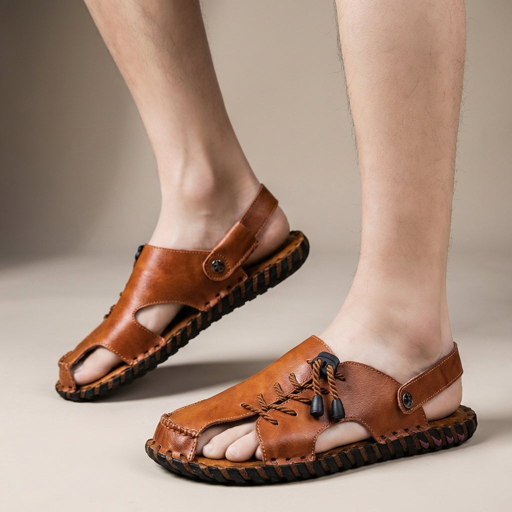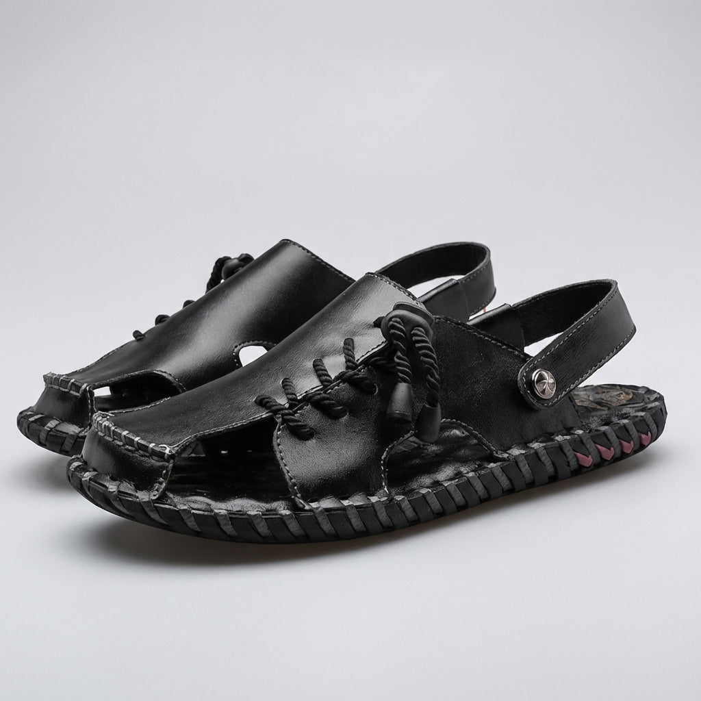 Crafted with a smooth, durable leather-look upper, these sandals provide a comfortable fit that adapts naturally to your stride. The open-toe silhouette is enhanced with refined moc-toe stitching and subtle decorative lacing across the vamp, delivering a sophisticated yet breathable feel. An elastic slingback strap ensures easy wear and a secure hold, while the sturdy textured sole offers dependable traction and a distinctive handcrafted finish. Pair effortlessly with tailored shorts or lightweight linen trousers for a polished summer ensemble.