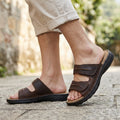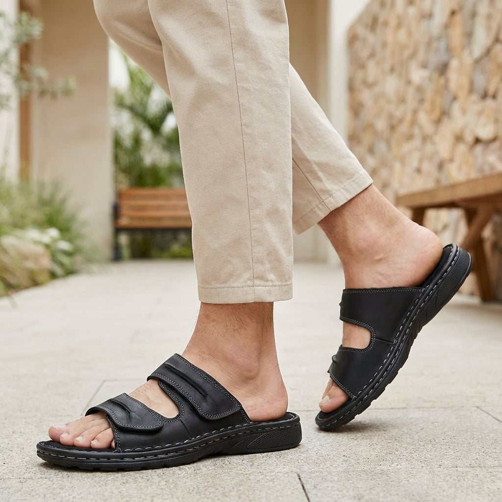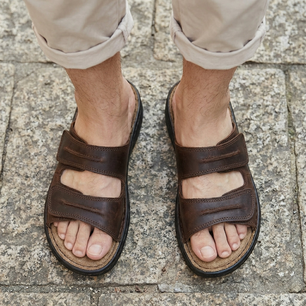 Crafted from supple, durable leather, these open-toe sandals feature a relaxed fit that cradles the foot in comfort. The dual adjustable straps ensure a personalized, secure feel, while the contoured cork-like footbed provides exceptional support for all-day wear. The visible stitching adds a touch of artisanal detail. Pair them with tailored linen shorts and a crisp polo for an elevated casual look.