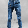 Distressed Slim Fit Denim Jeans, featuring edgy zipper accents and gothic buckle details for a bold statement. These slim-fitting jeans offer a modern silhouette and rugged aesthetic, perfect for adding an industrial flair to your wardrobe. Durable denim construction ensures lasting style and comfort.