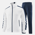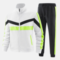 Two-Piece Slim Fit Full Zip Tracksuit Set, perfect for casual wear and light workouts. This set features a sleek, slim-fit jacket with a high collar and matching jogger pants with a drawstring for ultimate comfort. The ideal two-piece ensemble for a coordinated, stylish look.