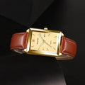 A solid rectangular wristwatch for men, crafted from leather, features classic Roman numerals and a practical date display. This timepiece is an ideal choice for business casual settings.