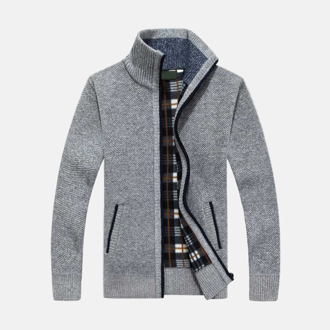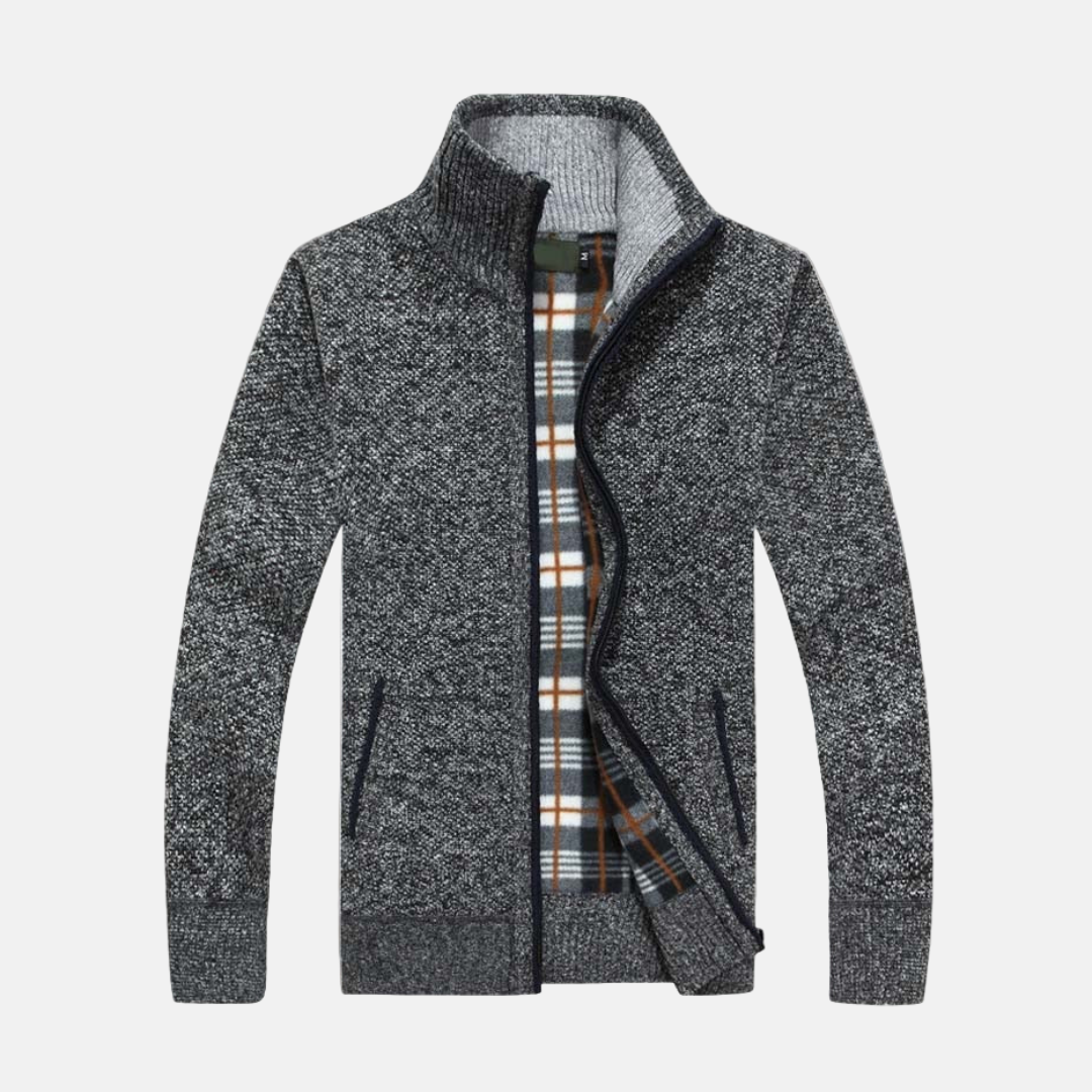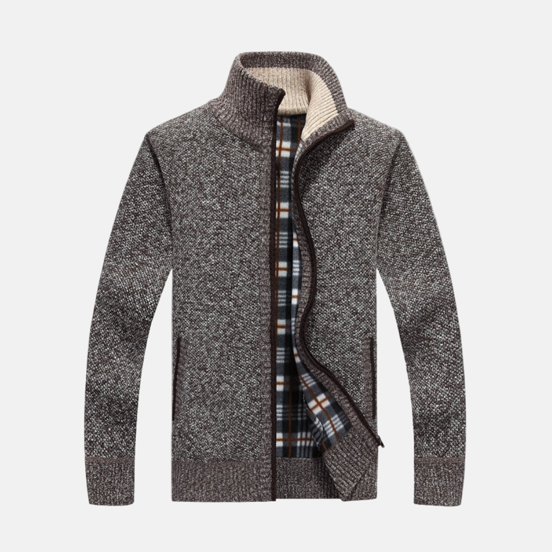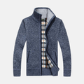 Embrace refined comfort with this Men's Regular Fit Sweater Jacket, designed with a sophisticated Funnel Collar and Long Sleeves. This Hip-Length piece features a solid design, enhanced by thoughtful details such as a convenient Zip Front, practical Side Pockets, and a distinctive Plaid Lining. The ribbed finish adds a subtle textural element, making it an ideal choice for casual occasions.