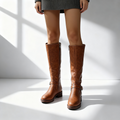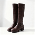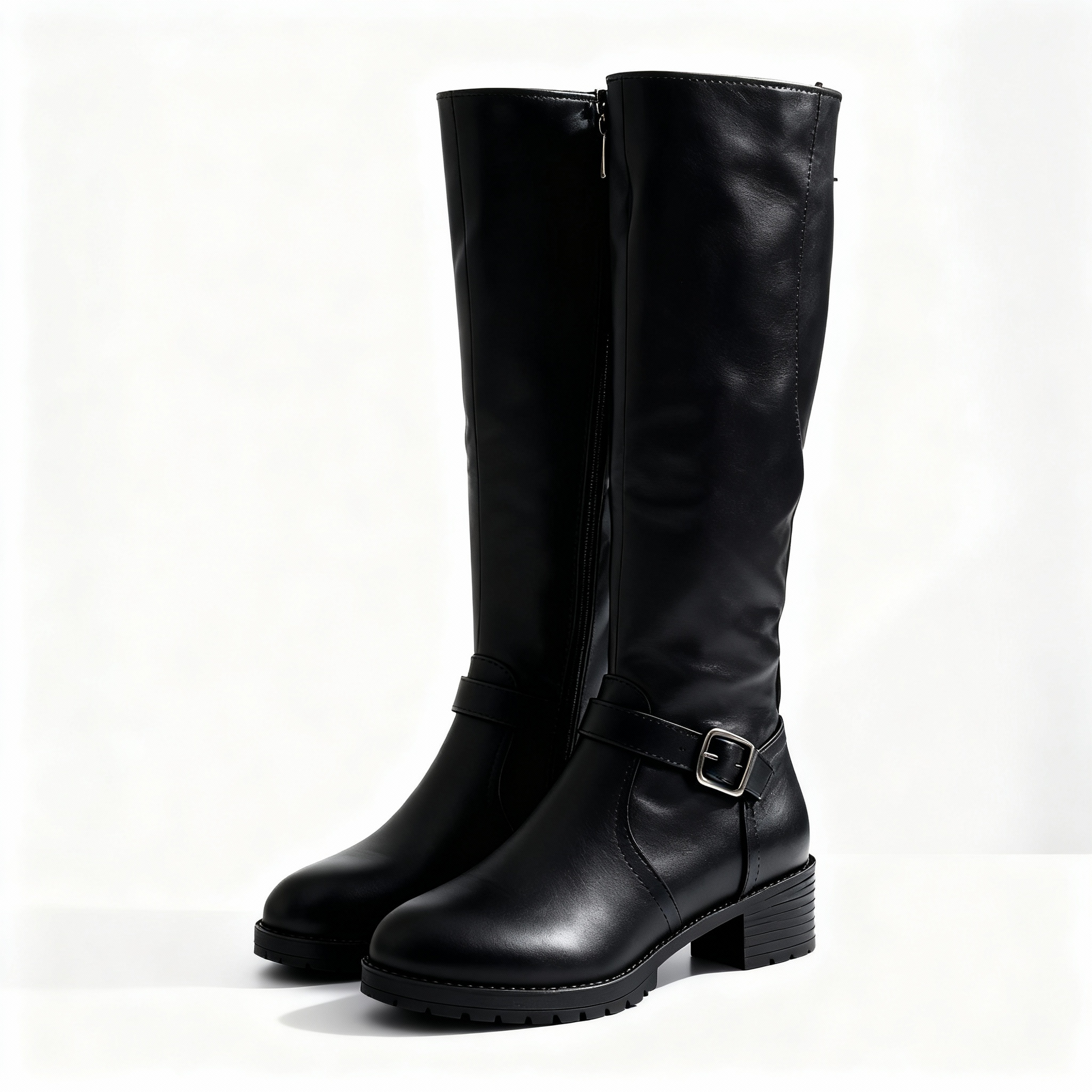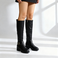 These Phoenix riding boots command attention with their knee-high silhouette and bold buckle accents. Crafted from quality faux leather with a chunky sole, they offer confident style and all-day comfort for everyday chic.