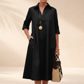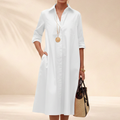 Crafted from a lightweight, breathable fabric, this A-line midi dress features a classic collared neckline and full-length sleeves that can be casually cuffed. The relaxed fit drapes beautifully, while discreet side pockets add a touch of practical charm. Cinch it with a stylish belt for a more defined waist, or wear it loose for a breezy, laid-back allure. Pair with artisan sandals for a day out or elevated espadrilles for an evening affair.