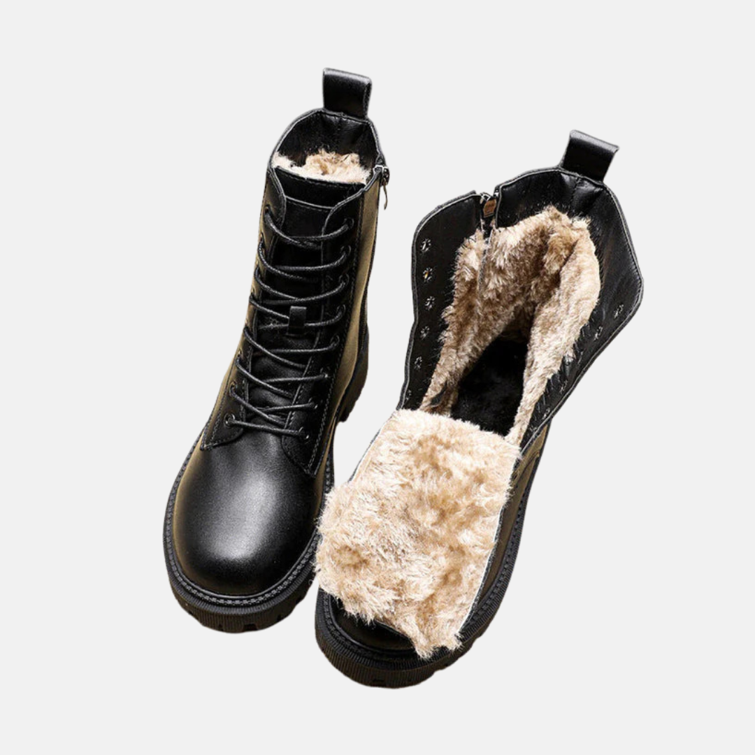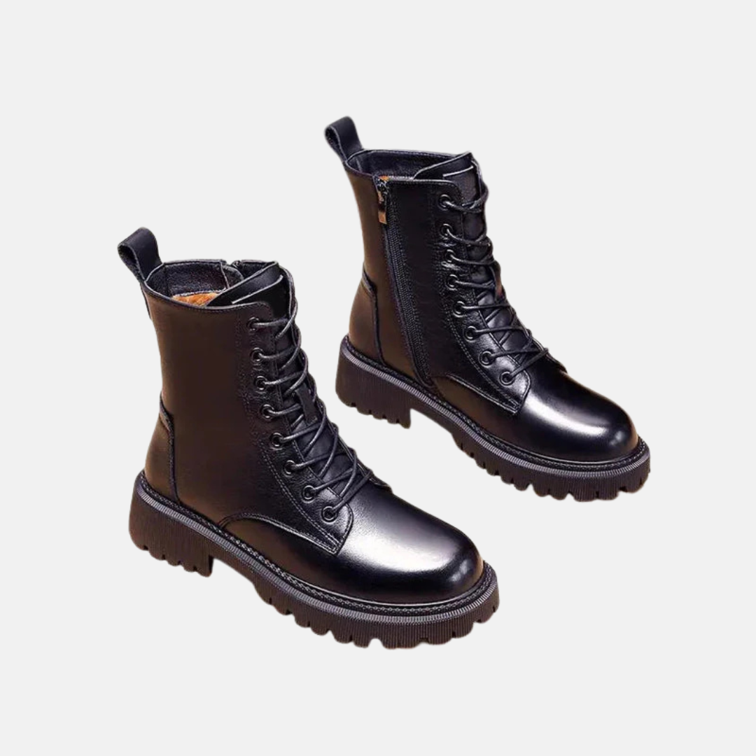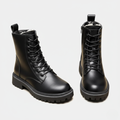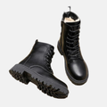 These ankle-length combat boots for women are designed with a solid pattern, perfect for winter. They feature a distinctive lace-up front, a chunky lug sole, and a convenient side zipper. A round toe, pull tab, and faux shearling lining complete the design.