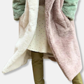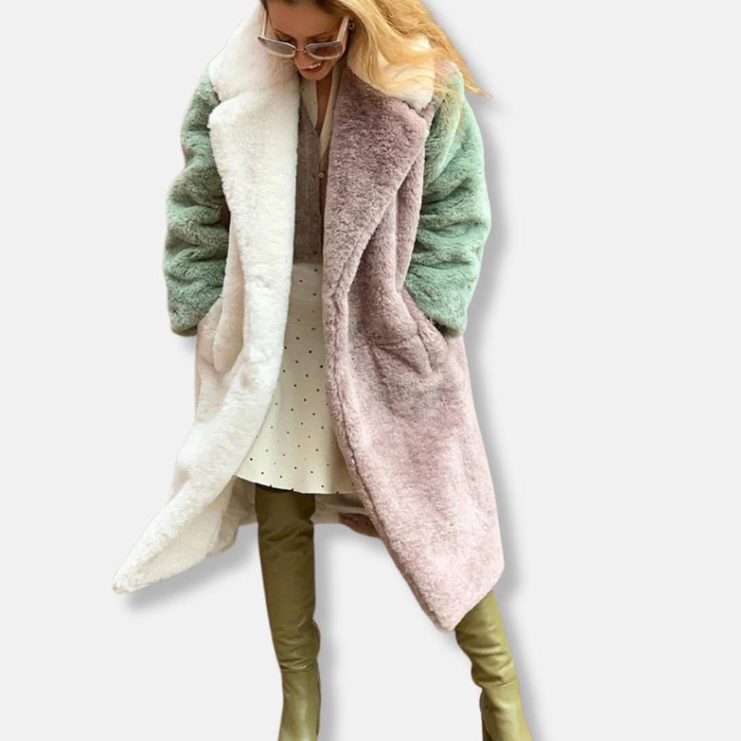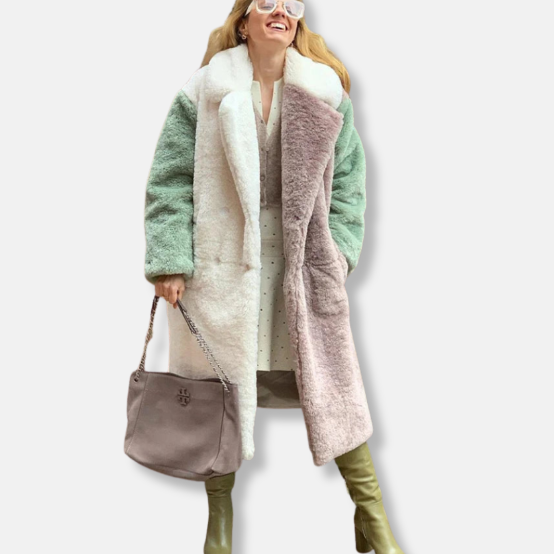 This oversized faux fur coat, crafted from soft fleece, offers a midi-length silhouette perfect for everyday wear. Featuring a sophisticated notch lapel and a button front, its long sleeves provide ample coverage.