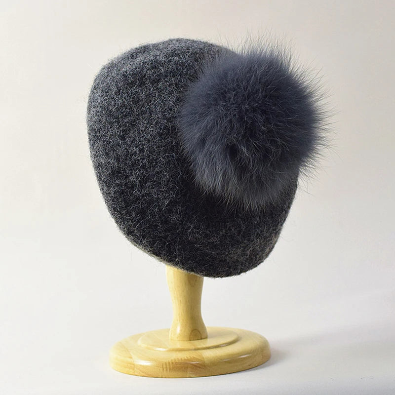 Embrace the cooler months with a relaxed fit beret designed for comfortable wear. This charming headpiece features a distinctive pompom detail and a soft, felted texture, adding a touch of classic elegance to your ensemble. It serves as an ideal accessory for your winter wear, providing both warmth and sophisticated style.